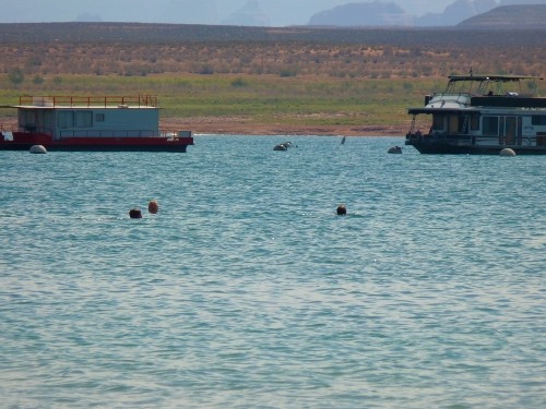 Der Tag begann genau mit dem, was man einem See tun sollte: Schwimmen! Nach dem Frühstück wurden alle Sachen gepackt und runter gings zum Lake Powell. Super angenehme Termperaturen schon am Morgen luden förmlich zum Schwimmen ein. Hier konnten wir auch mal längere Strecken hinter uns bringen, was eine willkommene Abwechslung zum Fahren und Wandern brachte. Man sieht auf dem Bild zwar nur einige schwarze Punkte im Wasser — aber das sind Steffi, Marius und Elena beim Frühsport ![]()