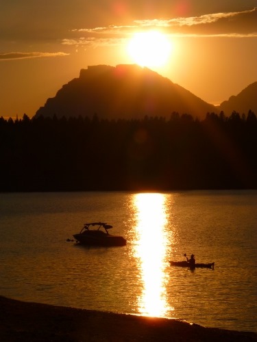 Da Marius noch seine Bilder konvertieren muss, hier erst einmal meins. Sonnenuntergang über Jackson Lake, auf dem immer noch einige Paddler unterwegs waren. Aber wie man schon auf dem Bild mit Marius sehen kann, war er voll bei der Sache dabei und wird mich wahrscheinlich