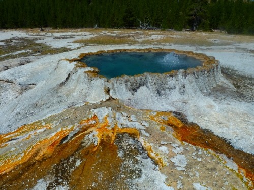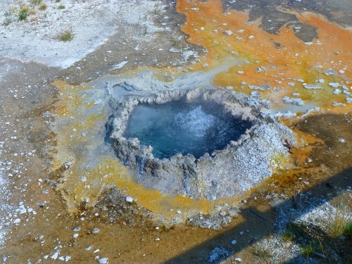 Stunden lang am Tag und immer wider werden Unmengen von Wasser ausgeworfen. Einige Pools haben noch einen Ausgang, den man gut durch die gelben Stellen beobachten kann, wo sich Bakterien angesiedelt haben, die selbst diesen Temperaturen widerstehen. Der blaue Pool unten war ein ganz