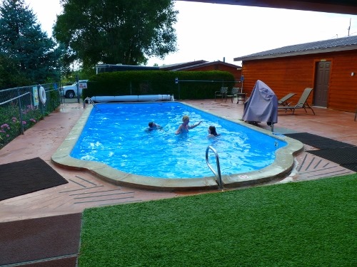 Jetzt sind wir am Campingplatz angelangt und Marius & Elena toben im Pool, bevor der Grill angeschmissen wird. Der Himmel zieht zwar mal wieder zu, aber hoffentlich können wir heute abend dann auch mal wieder ein Lagerfeuer anzünden, bevor es morgen in die amerikanische Vergangenheit geht.