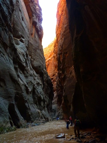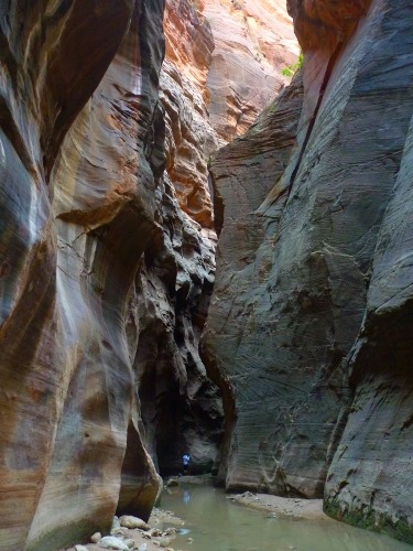 Auf jeden Fall waren wir dann endlich am Ende des Tals angekommen, von dem es dann weiterging in die Narrows – direkt durchs Wasser, sodass die Bergschuhe auch richtig schön von innen gefüllt waren. Das sandige Wasser machte es auch nicht einfacher, die nächsten Schritte zu planen – der Stock war hier das 3. Auge.