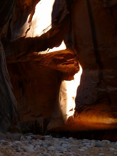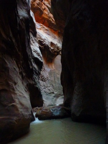 Manchmal war das Wasser dann doch für das kleinste Mitglied unserer Familie ein wenig hoch, dies hielt sich aber zum Glück in Grenzen. Der Lichteinfall, die hohen Wände und das Erlebnis durch den Bach waten zu müssen, sind einfach unbeschreiblich. Ziel war die “Wallstreet” Gabelung, die etwas 90 min. vom Einfang entfernt liegt. Von hier geht ein nochmals kleinerer Canyon (rechts zu sehen) vom Virgin River ab.