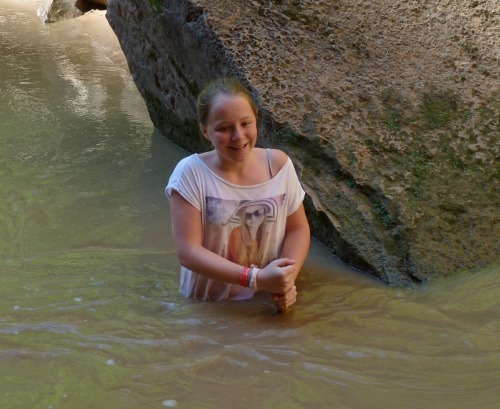 Glücklicherweise waren zwei Wanderer vor uns an dem mittleren Stein unterwegs, sodass wir sehen konnten, dass das Wasser hier so hoch ist (oder der Boden so tief), dass die gute Frau zum Schluss gegen ihren Willen sogar ein paar Schwimmzüge machen musste — und damit durch und durch nass war. Auf dem Rückweg bekamen wir immer mehr Sonnenstrahlen in den Canyon,