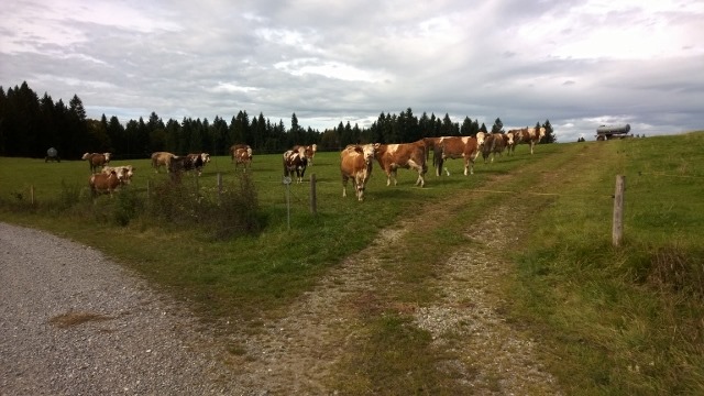 Schuhe nicht mehr von den Pedalen… — zum Anderen mussten mal sämtliche Schrauben am Bike nachjustiert werden, bevor es den ersten Trail abwärtsging. Schon bald ging es querfeldein, fast ohne Weg durch den Allgäuer Dschungel, bevor wir uns bei einer Kuhweide mit einer Elektrotherapie die Muskeln auffrischen konnten (was sich ehrlich gesagt gut schreibt, aber nur ein wenig lustig war