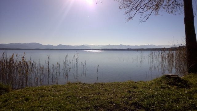 Über zahlreichen Bretterstege ging es durch das Leutstettener Moos hinab zum Starnberger See, wo schon über 30km für die Anfahrt auf dem Tacho standen. Dafür war der Blick über den See hinüber zu den Alpen einfach traumhaft – der Stand der Sonne tat das übrige dazu. Auf dem Weg nach Süden am See entlang, konnte man gar nicht genug bekommen