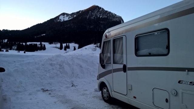 Die letzten Skifahrer machten sich gerade auf den Heimweg, als wir unseren Stellplatz mit Blick auf die Brecherspitze bezogen. Zum Abendessen hatten wir uns
