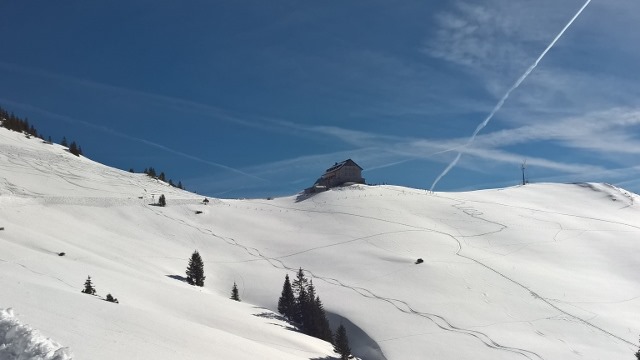Lawinenwarnschilder waren auch aufgestellt, da vor allem im oberen Bereich der Weg etwas den Hängen ausgesetzt ist. Der meiste Schnee war allerdings schon abgerutscht, sodass sich die Gefahr zum Glück in Grenzen hielt. Die Hütte selbst war trotz der vielen Tourengeher weniger besucht