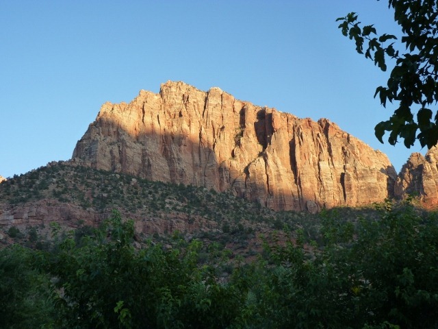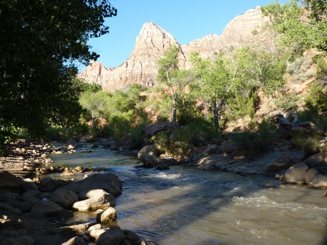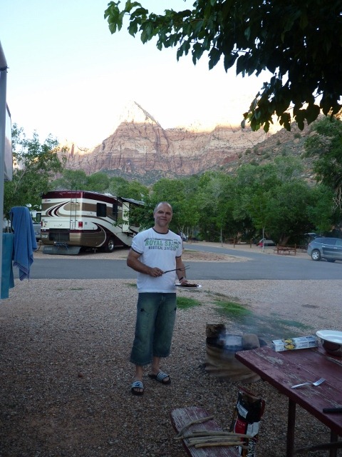 Unser Campingplatz liegt mittendrin – am Ausgang von Springdale, 500m vom Eingang in den Nationalpark entfernt. Der Virgin-River fließt etwa 50m vor unserem Camper und rund um uns können wir die Millionenalte Geschichte der Steine lesen. Fantastisch, wie sich hier Schichten auf Schichten legen. Geformt von einem Meer und dessen Ablagerungen, dann durch innere Kräfte angehoben auf über 3000m nur um wieder von Wasser durchfurcht und abgetragen zu werden. Ja, in der Landschaft kann man nur poetisch werden ![]()