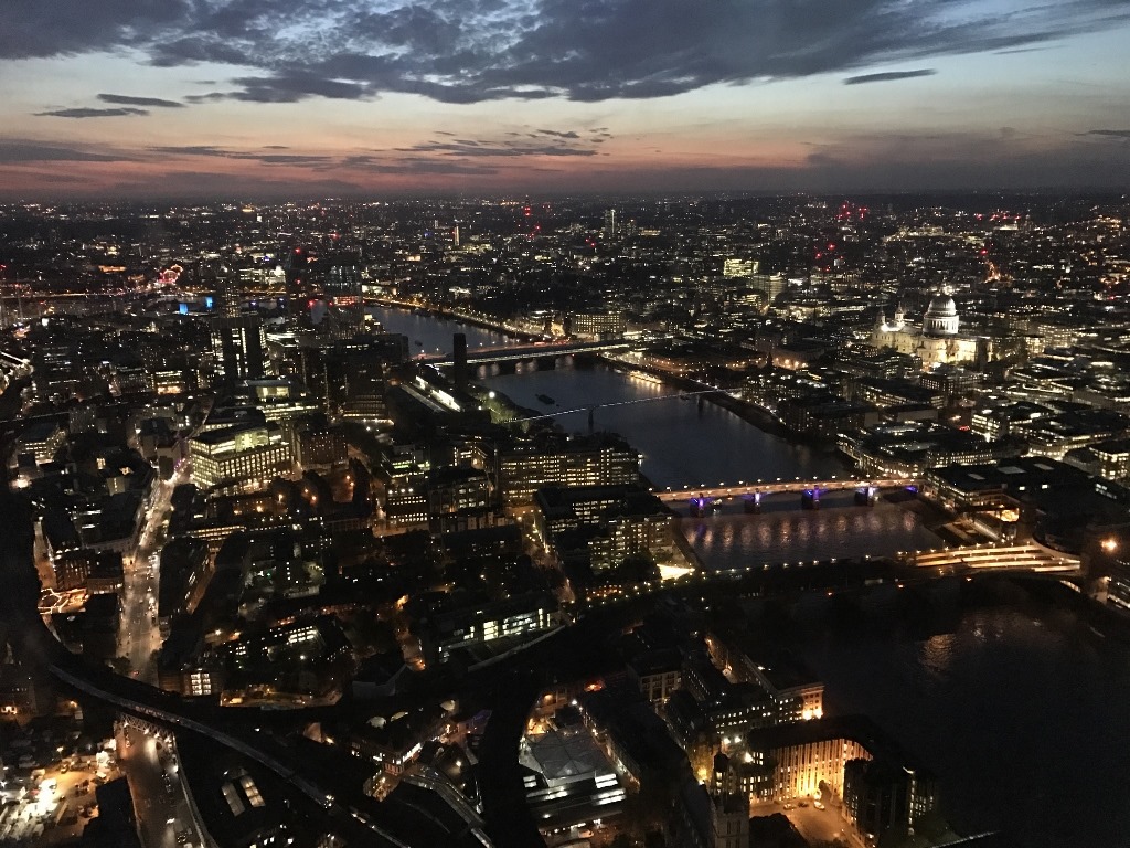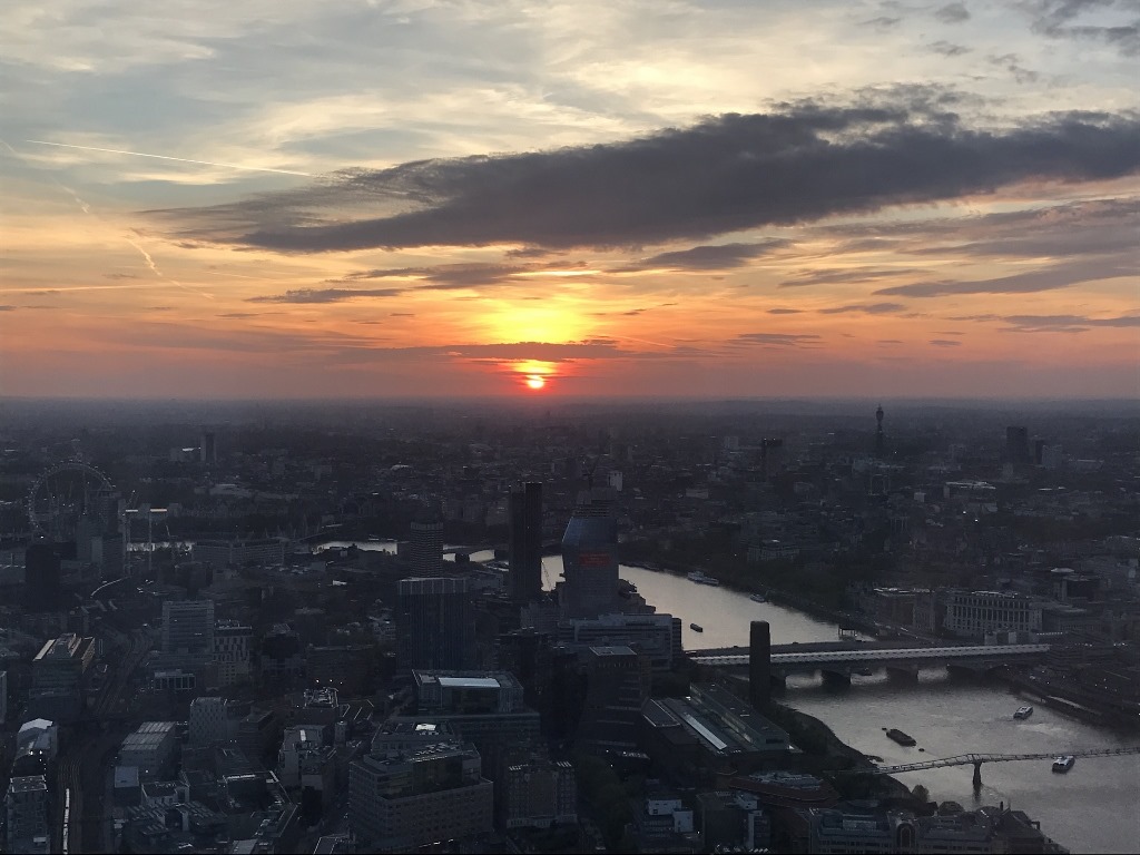 daraufhin hatten wir schon gestern die Karten für 19:00 Uhr bestellt, um den Sonnenuntergang 10 vor 8 anzusehen. Obwohl der Eintritt nicht ohne ist, hat es sich wieder (nach dem Rockefeller Center in New York) gelohnt. Wir konnten schon 18:30 auf den Turm in den 73. Stock fahren und London von oben sowohl bei Tageslicht, untergehender Sonne sowie in der Nacht genießen. Einfach fantastisch!