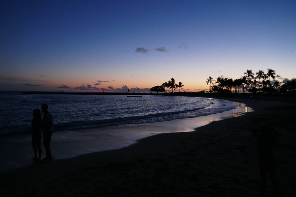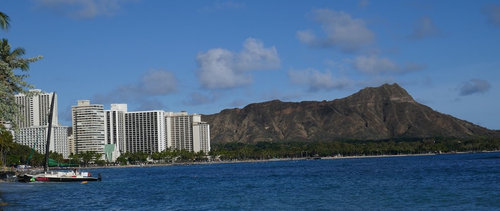 Die Zeit verging nicht nur im Flieger wie im Flug und 2 Filme später um 11:58 hieß es touch down in Honolulu auf Oahu. Schon bevor wir das Gepäck holen konnten, wurden wir mit einem Blumenkranz und einem Aloha freundlich begrüßt. Der Shuttle brachte uns danach in unser Hotel, wo wir unsere Koffer kurz abstellten, bevor wir zum ersten Mal zum Waikiki Beach aufbrachen.![]()