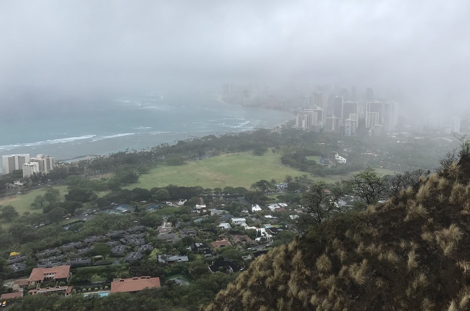 Kraters brachte. Von dort führte der Weg erst asphaltiert, dann über Lavagestein, Treppen und Tunnel hinauf zum Ausblick, der uns allerdings heute nur bedingt beschieden war. Kurz vor dem Gipfel begann es aus Gießkannen zu regnen. Ein kurzer Blick auf Waikiki, dann waren die Wolken schon da.