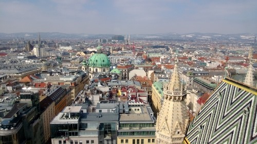 Aus der Gruft zurück zum Stefansdom nahmen wir dann über 300 Stufen auf einer engen Wendeltreppe in Angriff mit dem Ziel den Südturm zu erklimmen. Leider ist dabei nach 67m Schluss und die Treppe endet im Turmstüberl, das früher von der Feuerwehr genutzt wurde, um Feuer in Wien