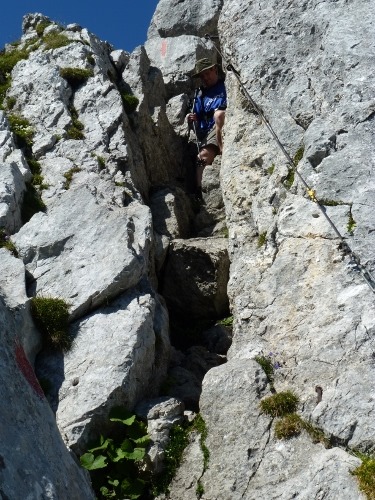 Zurück zur Gabelung begannen wir den Durchstieg durch den Zahmen Kaiser – vorbei am Einser und Elferkogel immer leicht ansteigend auf einer Hochebene durch niedrige Gewächse Richtung Pyramidenspitze. Durch eine knifflige Stelle (einer kleinen Felsenrinne) hindurch kamen wir dann