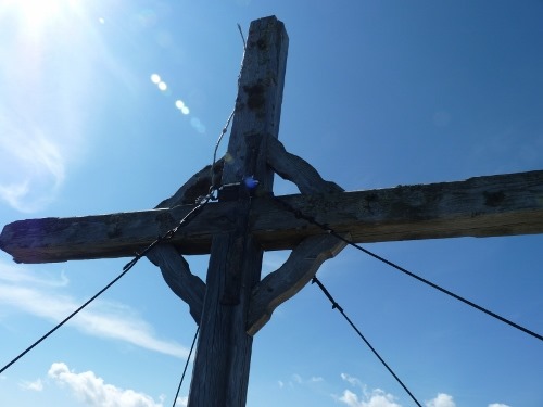 gegen 11:00 Uhr auf der höchsten Stelle unser diesjährigen Tour an. Dass dies die höchste Stelle sein sollte, zeigte uns nicht nur die wieder sensationelle Aussicht und ein massives Gipfelkreuz, sondern auch ein heftiger Abstieg durch viel Kieß und Geröll zurück auf etwa 1400m Höhe auf etwa einem halben Kilometer Strecke – in gleißender Sonne und der einhergehenden Hitze.