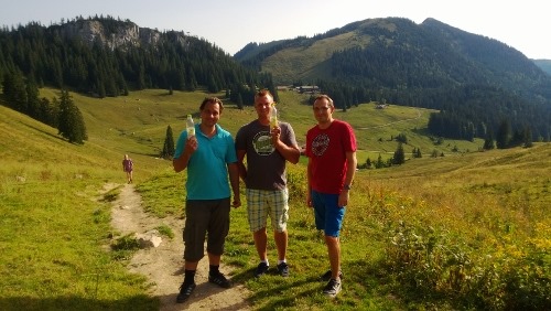 In gut 45 min. waren die Almen erklommen, auf denen die ersten Übernachtungsgäste ihr Frühstück nahmen. Ein wenig Wasser und Apfelschorle sollte uns genügen. 15min über der unteren Firstalm konnten wir auf dem Suttenstein einen wunderbaren Blick auf die andere Seite des Berges nehmen hinunter Richtung Tegernseer Tal.