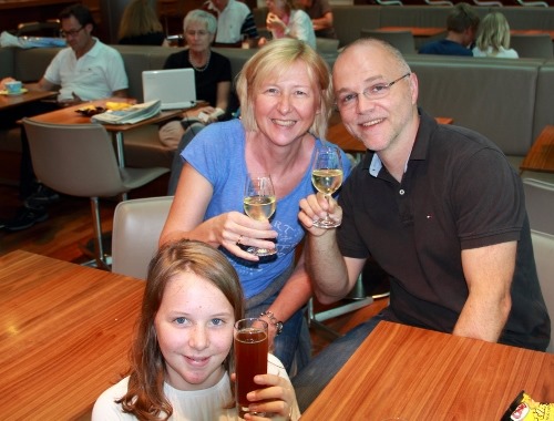 Der erste Sekt in der Lounge — und der Druck fällt langsam ab. Ein gemütliches Mittagessen mit Salat und Leberkäs. So ließ sich die Zeit bis zum Boarding angenehm überbrücken. Beim Verlassen mussten wir allerdings feststellen,