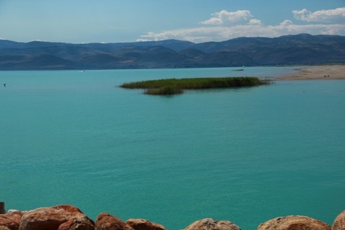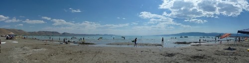 daher, dass wir auf den Strand fahren durften und direkt am Wasser parkten. Kurz umgezogen und schon ging es ins türkisklare Wasser des Bergsees auf 1800m Höhe – ein Tag zum genießen. Der steinlose Sandstrand fiel nur langsam ab, sodass wir noch 50 m weiter draussen immer noch bequem stehen konnten – die Temperatur war trotz der Höhe noch super angenehm und die Lufttemperatur wahrscheinlich über 30 Grad — und das auf der Höhe! Unten das Panaromabild von unserem Strand, der sich etwa 4-5km in die Länge zog.