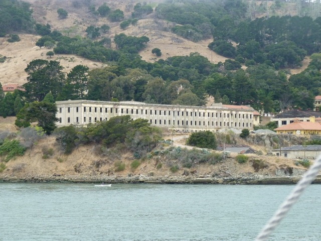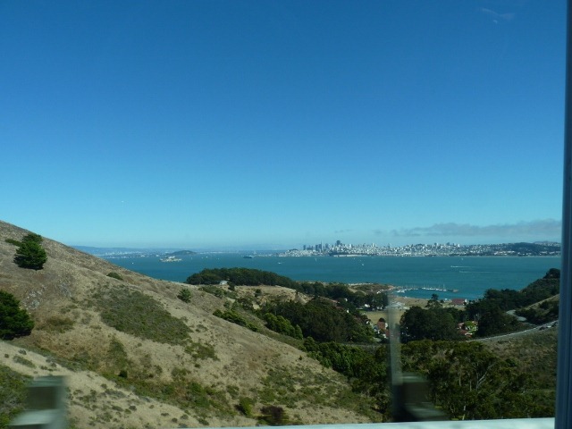 P1000910 (640x480)Um 10:00 Uhr ging es mit der Fähre von Lakespur nördlich von San Francisco in einer halben Stunde zum Fährhafen mitten in der Stadt. Das allein war schon ein Höhepunkt – es ging vorbei an Alcatraz mit Blick auf die alten Gefängnisanlagen, der Golden Gate Bridge, die noch wolkenverhangen war und zuletzt ging es auf die Skyline von SFO zu.