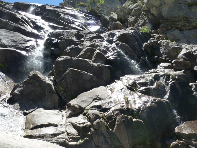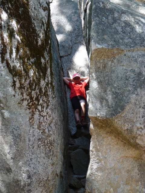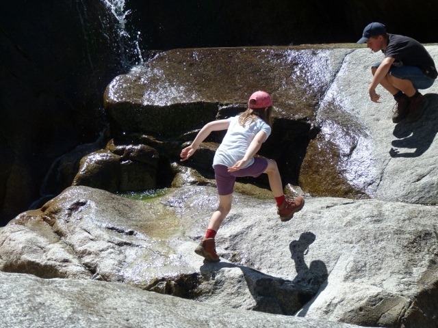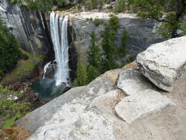 Über Stufen, den Vernal Fall immer fest P1010149 (640x480)im Blick, ging es durch eine P1010136 (640x480)kleine Schlucht hoch zur Spitze des Wasserfalls, hinter dem ein kleiner Bergsee zu finden war (Emerald Pool), in dem jedes Schwimmen leider tödlich enden kann, da die Strömungen jemanden sehr schnell zum Wasserfall ziehen können. Von hier kann man auch schon den oberen der beiden Wasserfälle P1010156 - Kopie (640x480)sehen, den Nevada Fall, den wir allerdings nicht mehr besteigen wollten (nach 400 Höhenmetern wären nochmal 300 fällig gewesen, und diese hätten auch wieder nach unten gegangen werden müssen).