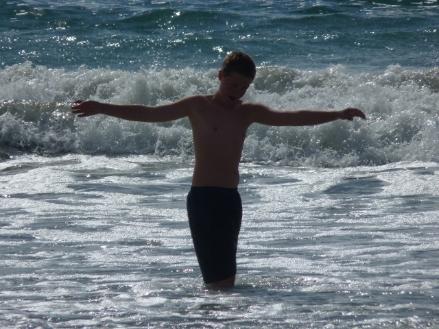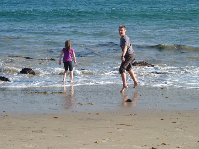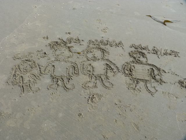 an dem sich Marius und Elena nach der Fahrt austoben konnten und sich den Wellen entgegen stellten. Im Sand verewigten wir uns zumindest für einen Tag, wie Ihr auf dem Bild sehen könnt.