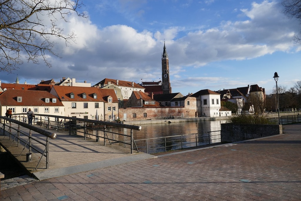 In Wörth an der Isar hatten wir dann prima Sicht auf die Wolkenmachmaschine, wie sie Tobi treffend Kraftwerkbezeichnete. Das Atomkraftwerk ist ein gewaltiger Kontrastpunkt zur Natur und den Tieren am Fluss – für ein Foto hält es aber allemal her. An der Stelle war es dann auch von Vorteil, das südliche Ufer gewählt zu haben, da wir am nördlichen einen ziemlichen Bogen um das Kraftwerk hätten einschlagen müssen. Der rückgestaute See hat schon gewaltige vor LandshutDimensionen und im Sommer eignet sich der bestimmt gut für Segler und Ruderboote. Für uns bedeutete es allerdings eine ewig lange gut überschaubare Strecke entlangzuwandern — und dies ohne eine einzige Bank am Weg. Aber jede Tour hat auch ein Ende – nach 32km konnten wir die Altstadt von Landshut genießen und hatten das Glück noch einen Mittagstisch im Landshut